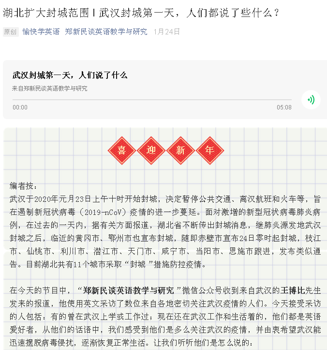 1月23日,腊月廿九,武汉下达封城令,暂停所有市内交通工具,关闭所有离汉通道。听到这一消息,王老师说他哭了,他最担心的事情还是发生了。擦干眼泪,他做了第一件志愿工作:用英语采访遍布全球的十多个地大“外语人”,请他们谈谈此时此刻的感受和心愿。该英语采访文稿和录音,次日(除夕)发表于上外“郑新民谈英语教学与研究”公众号(https://dwz.cn/VCTtLYnz),