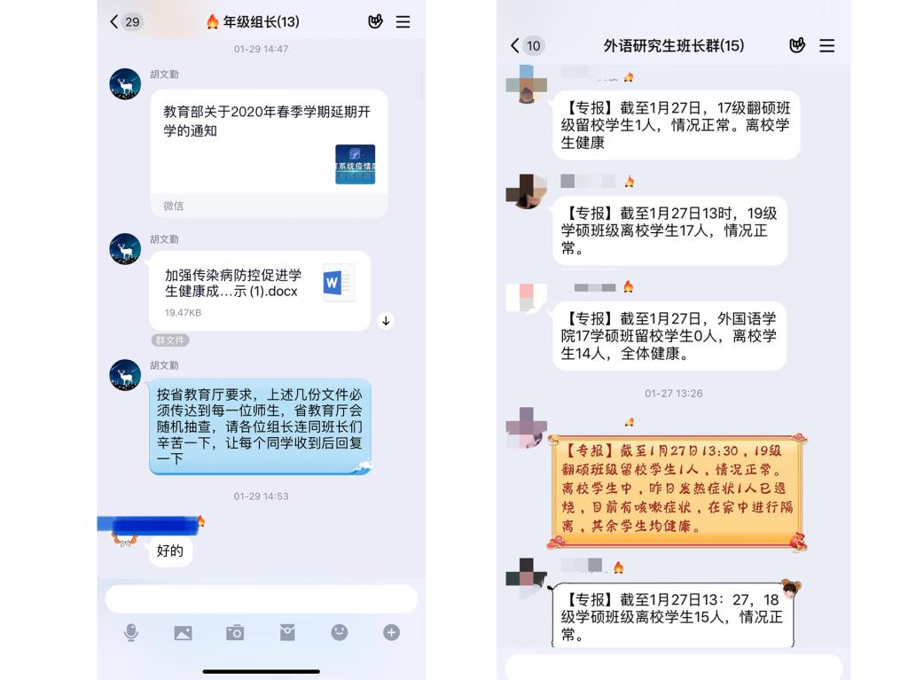 1.落实平安日报制度。1月24日,从一声声“新春快乐,平平安安”开始,九一果冻制作传媒视频开始了同学们每天的平安报告,坚持“零报告”制度,做到本研学生100%全覆盖。与此同时,学院辅导员通过年级群、班长群、学务指导和班主任群、学生党员群、家长群等做好疫情防控的引导宣传工作,时时转发科学防疫注意事项以及相关工作通知。