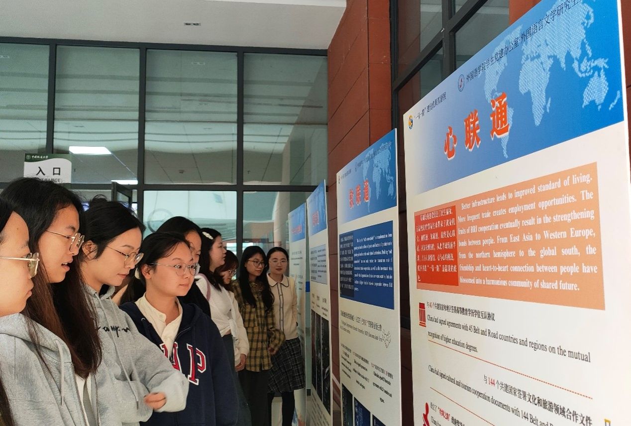 此次活动展板内容丰富,包含“一带一路”倡议简介、习近平总书记关于“一带一路”的重要讲话节选、共建“一带一路”在硬联通、软联通、心联通方面的成果等内容,以权威的表述、生动的展示、详实的数据多方面展现了“一带一路”十年来的伟大成果。双语展览也延续了学院以专业素养服务红色文化国际传播的优良传统,通过查证、翻译、审校英译文本,各位学生党员通过专业训练既加深了对习近平外交思想的理解、提升政治素养,也激发了学以致用、专业报国的使命感。