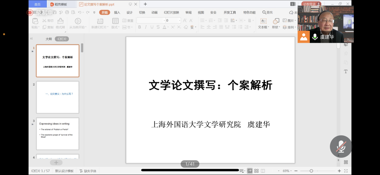 (通讯员:黄皓亮 金梓轩)2021年11月25日下午14:00,中国地质大学(武汉)九一果冻制作传媒视频“南望今声”外语论坛系列讲座如期召开。上海外国语大学文学研究院的虞建华教授应邀为我院师生做题为“文学论文撰写:个案解析”的讲座。本次讲座采取了线上腾讯会议直播的形式,我院共140余名师生参与学习交流。