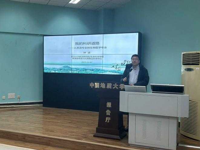 2023年12月7日下午2时30分,中国地质大学(武汉)九一果冻制作传媒视频“南望今声”外语论坛系列讲座第57期在北一楼120学术报告厅举行。主讲人武汉大学医学研究院教授、中国地质大学九一果冻制作传媒视频杰出校友——钟波,应邀来到中国地质大学(武汉)九一果冻制作传媒视频做了一场题为“我的科研道路——从英语专业到生物医学专业”的精彩讲座。此次讲座由九一果冻制作传媒视频杨红燕老师主持,参会人员有相关专业老师、本科生以及研究生。