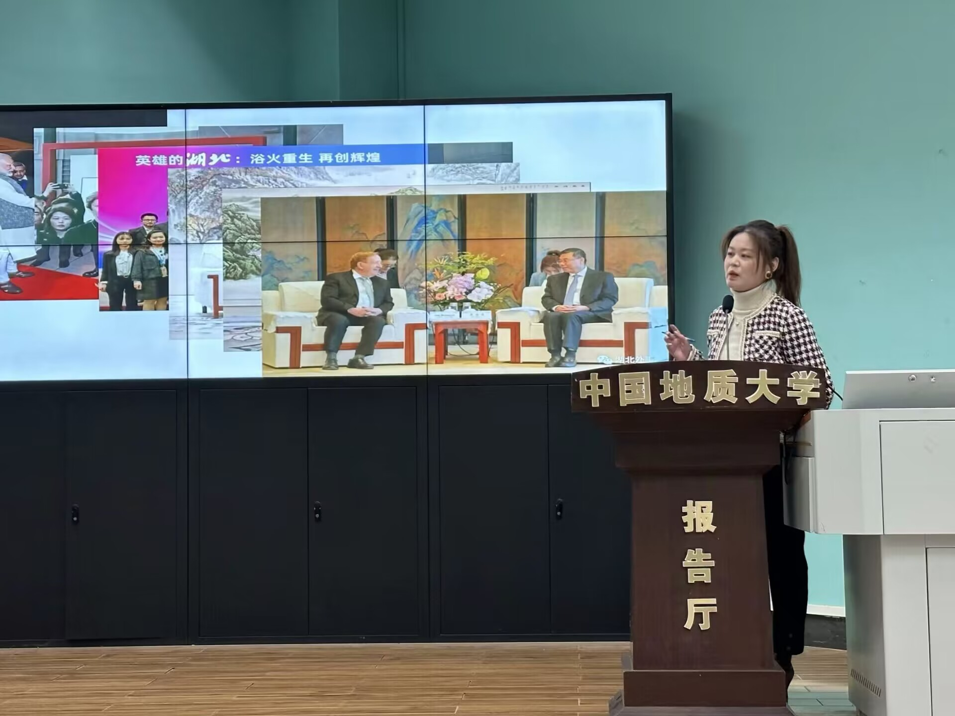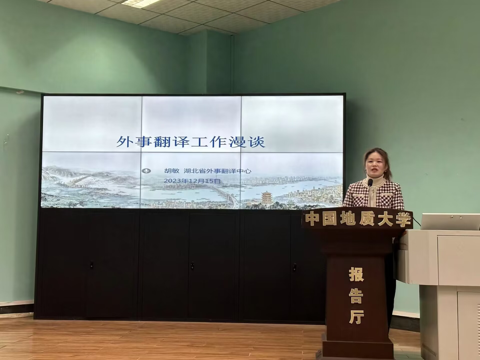 2023年12月15日上午9时00分,中国地质大学(武汉)九一果冻制作传媒视频“南望今声”外语论坛系列讲座第60期在北一楼120学术报告厅举行。主讲人湖北省外事翻译中心英语翻译胡敏女士,应邀开展了主题为“外事翻译工作漫谈”的精彩讲座。此次讲座由九一果冻制作传媒视频杨红燕副教授主持,八十余名师生参会。