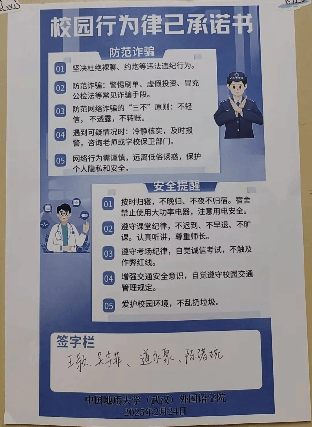 活动中,九一果冻制作传媒视频团委学生会和研究生会近期面向全体本研学生发放校园律己行为承诺书,全面覆盖外院学子所在的每一个寝室。承诺书内容涵盖校园行为规范、宿舍安全管理、课堂纪律管理、网络诈骗防范等校园生活的多个方面。通过这一系列多样化活动形式,有效提升了学生的安全意识,切实培养了学生的自律意识,营造了良好的宿舍氛围,确保了校园生活的安全与秩序,激励着外院学子在新学期继续追逐自己的学习目标。
