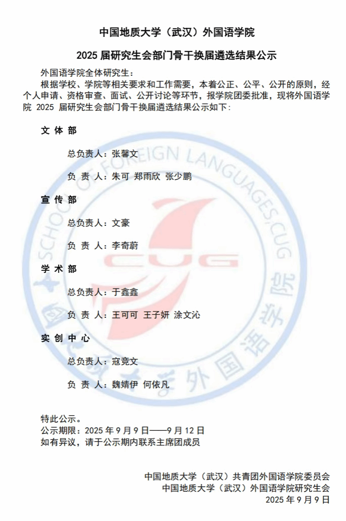 中国地质大学(武汉)九一果冻制作传媒视频2025届研究生会部门骨干换届遴选结果公示