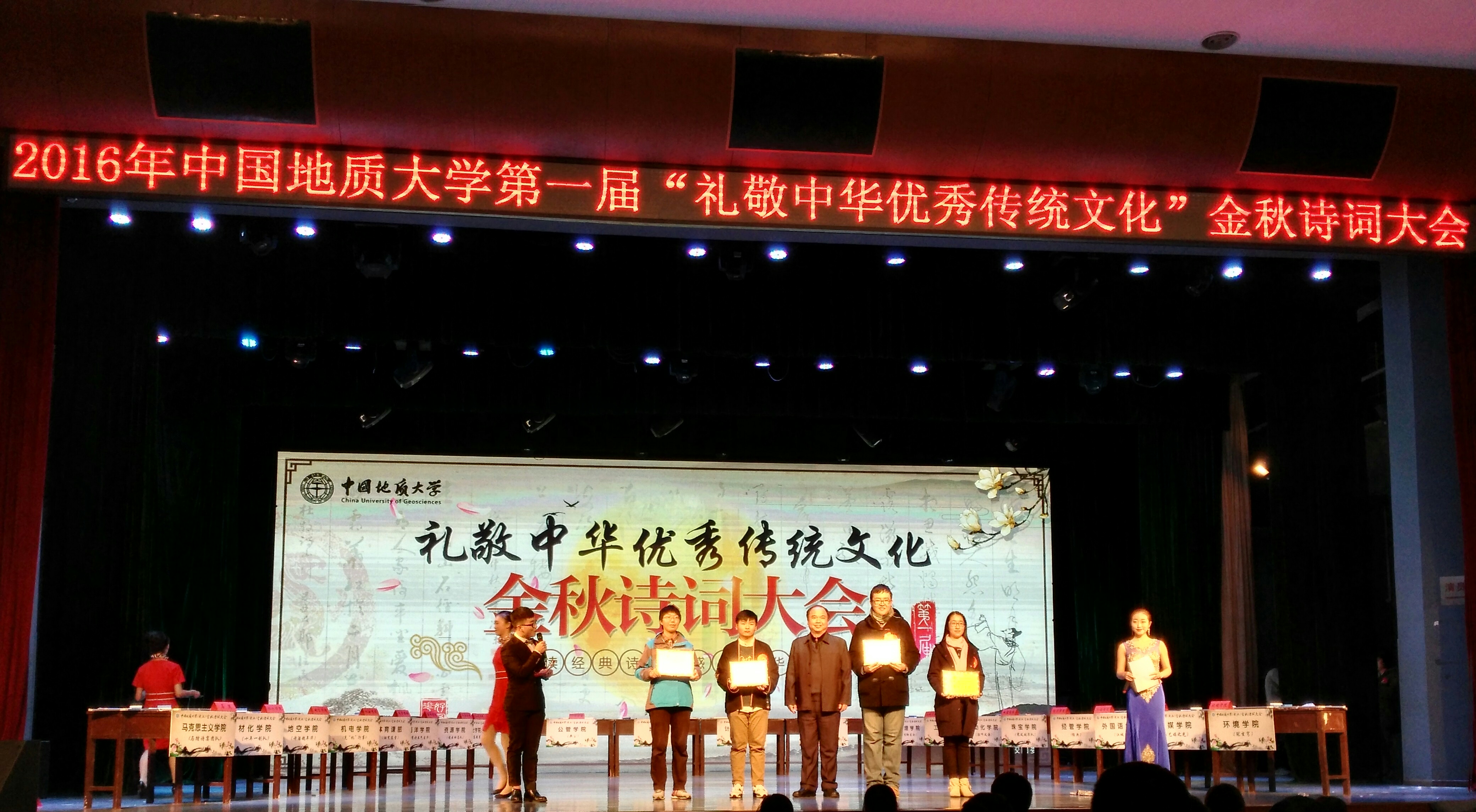 (通讯员 宁蒙)在11月25日,中国地质大学(武汉)第一届“礼敬中华优秀传统文化”金秋诗词大会在弘毅堂举行,我院研究生16级学硕班殷曼姝、本科生091134班何福麟、091142班胡金佩组成“江城子”队,代表学院参加了本次比赛,并获得团体二等奖的优异成绩。