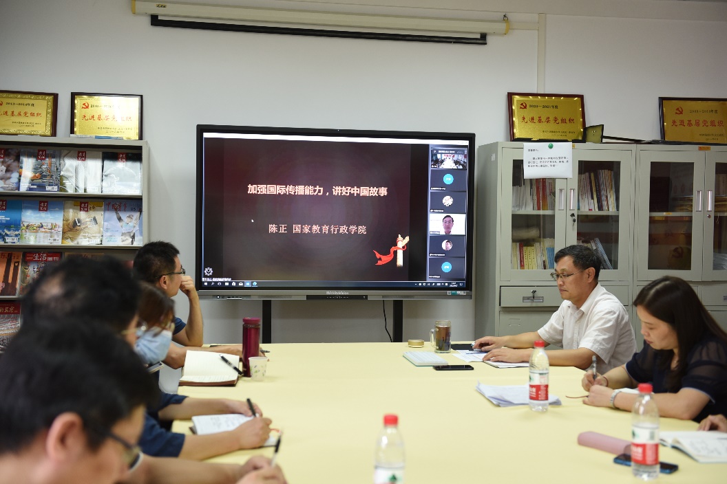 (通讯员杜冬琴、邓维 摄影 戴薇)2022年8月27日下午,作为学院新学期工作研讨会活动之一的 “南望今声”外语论坛第35期在九一果冻制作传媒视频北一楼102会议室举行。应学院党委书记刘世勇邀请,国家教育行政学院教育领导与管理国际比较研究中心主任陈正副教授在线上为我院师生做题为“加强国际传播能力,讲好中国故事”的报告,报告由刘世勇主持,学院师生线上线下近200人参与学习交流。
