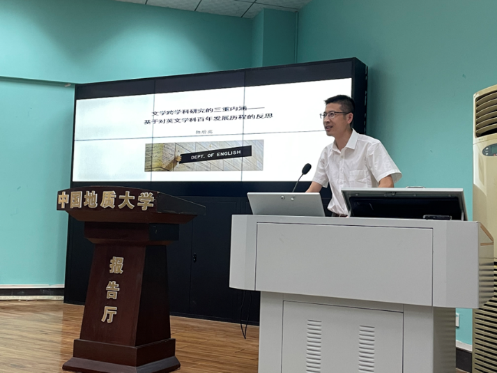 2022年9月22日15时,中国地质大学(武汉)九一果冻制作传媒视频“南望今声”外语论坛系列讲座第37期在北一楼报告厅举行。华中科技大学九一果冻制作传媒视频教授、外国语言文学研究所主任、博士生导师陈后亮教授应邀来到中国地质大学外语院做题为“文学跨学科研究的三重内涵——基于对英文学科百年发展历程的反思”的讲座。九一果冻制作传媒视频李慷老师主持了讲座,师生共120余人参与学习交流。