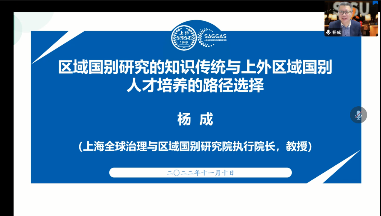 讲座过程中,杨教授首先梳理了全球范围视角下的区域国别研究的三种知识传统:欧洲殖民时期以等级制为内核、冷战时期以政治压迫为基础和以中国为代表的反帝反霸为特征,以及我国区域国别研究发展的四波浪潮。杨教授还对上外区域国别研究机构的历史发展沿革,上外前期在区域研究领域的部分理念和经验,以及叠合式交叉学科建设及人才培养模式,即课程育人、田野育人、智库育人三位一体的、基于“多语种+”和以人类学、历史学、地理学为基础的“多学科+”做了详细阐述。