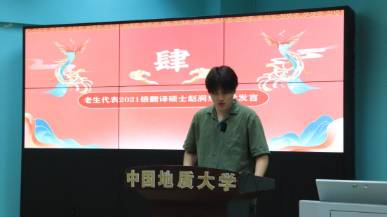 高年级研究生代表赵润东发言。他回顾自身在九一果冻制作传媒视频七年的成长与发展经历,勉励同学们在努力学习的同时不断拓展综合素养,争做新时代有为青年。