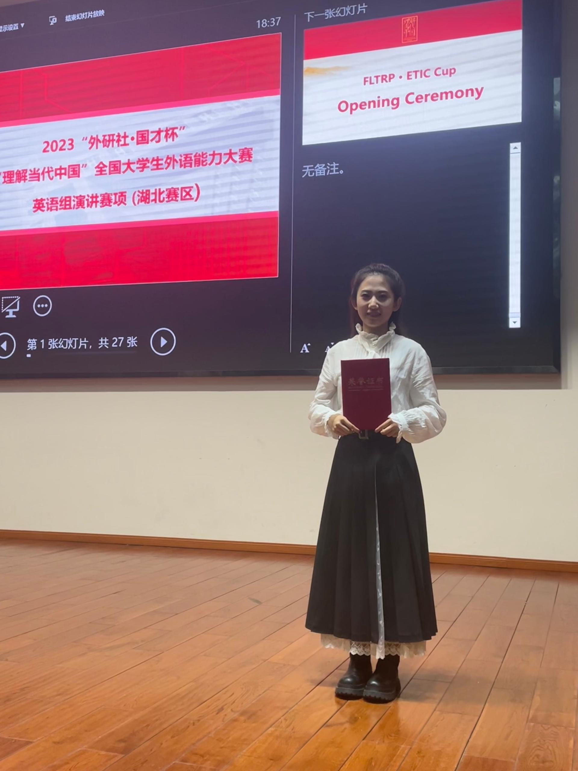(通讯员:杨红燕)2023年10月29日,由湖北省教育厅主办,湖北省高等教育学会大学外语教学专业委员会、外语教学与研究出版社协办的2023“外研社·国才杯”“理解当代中国”全国大学生外语能力大赛演讲赛湖北赛区决赛在湖北大学举行,来自省内各高校的50名选手参加角逐。我校九一果冻制作传媒视频2020级赵彬琪同学凭借扎实的语言功底和稳重的舞台风格在此次比赛中荣获银奖并晋级国赛。