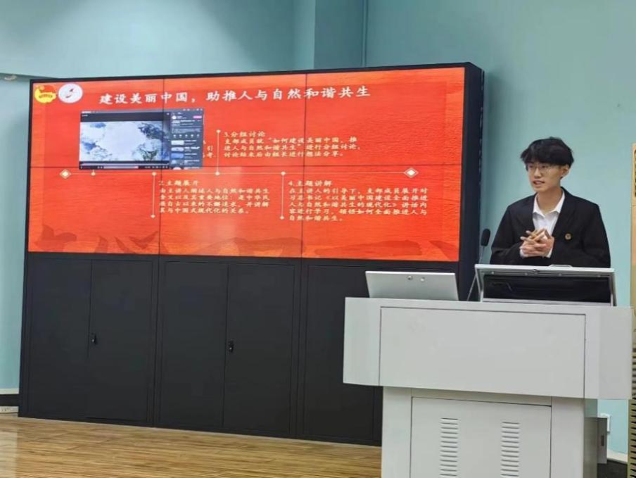 091234团支部书记王思旸以“青春砥砺,红旗领航”为主题,分别从支部结构、思想建设、活动开展、未来发展这几个方面来进行介绍,强调支部在开展团日活动时致力于从乐中学,,体现出091234团支部对于建设活力型、学习型团支部的积极性。