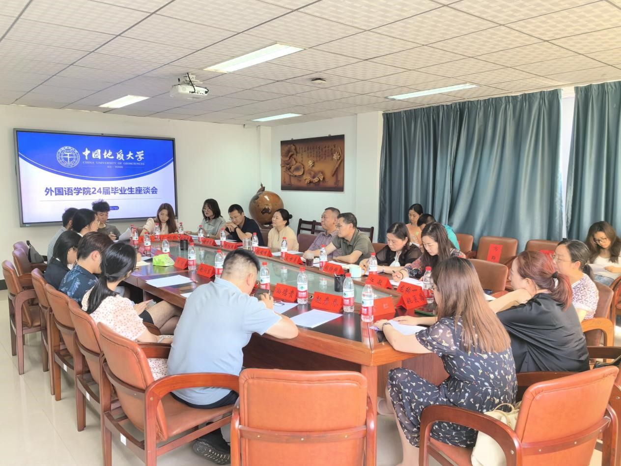 座谈会上,同学们踊跃发言,围绕人才培养、就业指导、教育管理等方面积极建言献策。李可同学谈到,语言是消除偏见的工具,是在国际交流合作和斡旋的艺术,是外交领域捍卫国家利益的利器。科技的发展将给语言工作者带来巨大挑战,但也推动我们更深入挖掘语言的深层次内涵,这四年的学习和生活在我们人格完善的重要时期镌刻下了独特的外院印记,毕业人生旅途的中转站而不是终点站,我们将带着在地大外院的所学和所感,带着老师的期望和祝福,开启人生的下一篇章。唐湘林同学谈到,学校和学院为我们提供了全面发展的平台。希望学院持续大力帮助学生了解和接触就业市场,促进学生提前做好就业认知与准备,使其在未来的职业道路上更加从容自信。通过回顾在矿大求学期间的成长与收获,同学们深切表达了对母院悉心培养的感恩之情,衷心祝愿母院事业发展蒸蒸日上。赵润东同学表示自己已经是在学校学习7年的“二度毕业生”了,在外语学院的七年生活转瞬即逝,十分感谢学院对他的培养,祝愿外语学院发展越来越好,祝愿各位老师桃李满天下,在未来希望都可以遇见更好的彼此。杜熙熙同学表示非常感谢九一果冻制作传媒视频的各位老师,给她们提供了很专业的指导,并参加了很多研究方向相关的学术会议。基于硕士研究生阶段的学习与积累,出于对学科的喜爱,并综合考虑未来就业规划,她选择继续攻读博士学位,同时很感谢各位老师给我提供的指导与建议,让她可以顺利申请到博士学位。