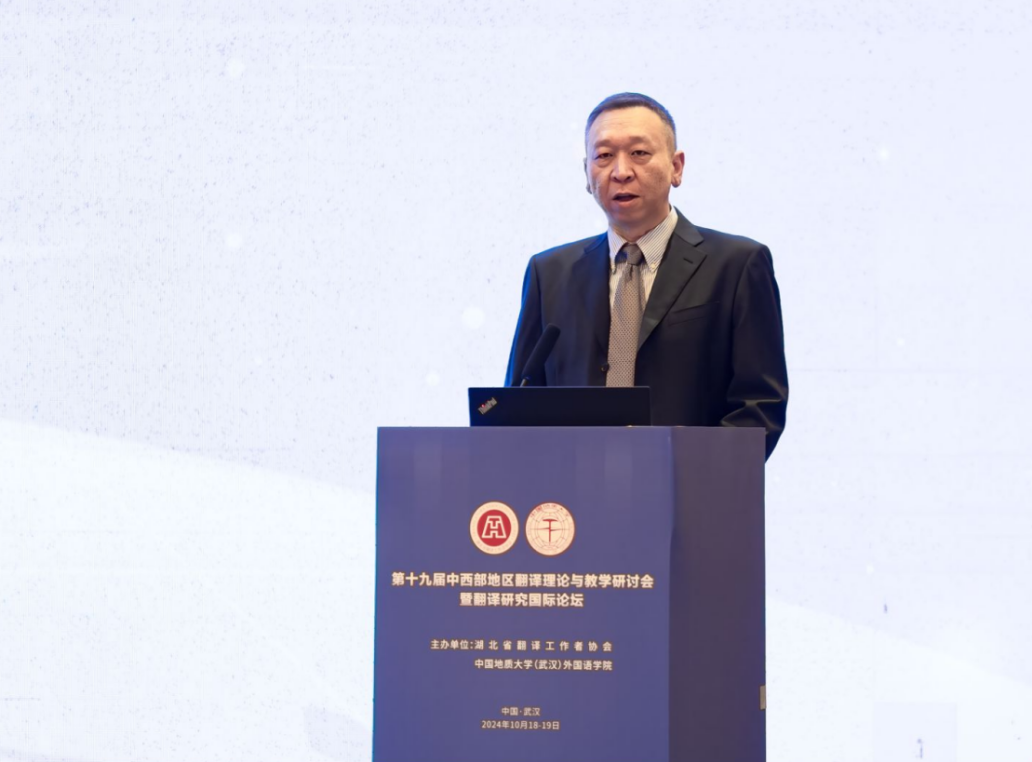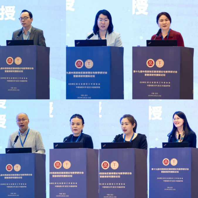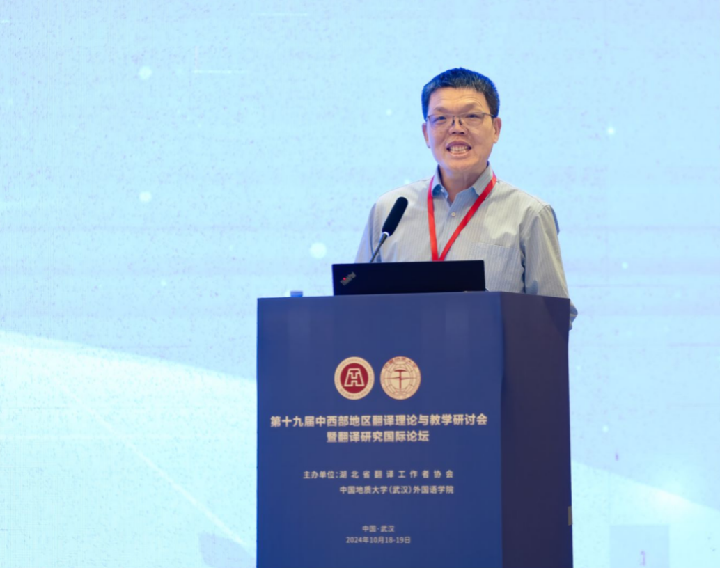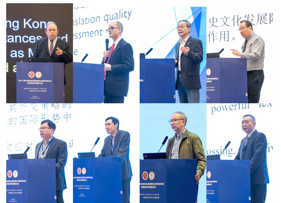 香港城市大学中文、翻译和语言学系系主任 Jonathan Webster教授、香港恒生大学翻译及外语学院院长Mark Shuttleworth教授、香港中文大学(深圳)翻译学朱纯深教授、武汉大学外国语言文学学院刘军平教授、上海外国语大学校长助理胡开宝教授。北京外国语大学高级翻译学院副院长姚斌教授、上海外国语大学高级翻译学院柴明熲教授、中国地质大学(武汉)九一果冻制作传媒视频院长张峻峰教授等8位专家分别作主旨演讲。主旨发言涵盖了数智时代的翻译技术与实践应用、元宇宙翻译范式与跨文化传播、翻译研究领域的发展变化、现代翻译行业发展、人工智能时代口译教学与研究新趋势、外交话语翻译等多个研究领域,发言高屋建瓴、深入浅出,既有前瞻性、开拓性和学理性,又不乏指导性、实践性和应用性,为中西部地区乃至全国翻译学界和业界的可持续性发展与创新发展提供了多维研究思路。