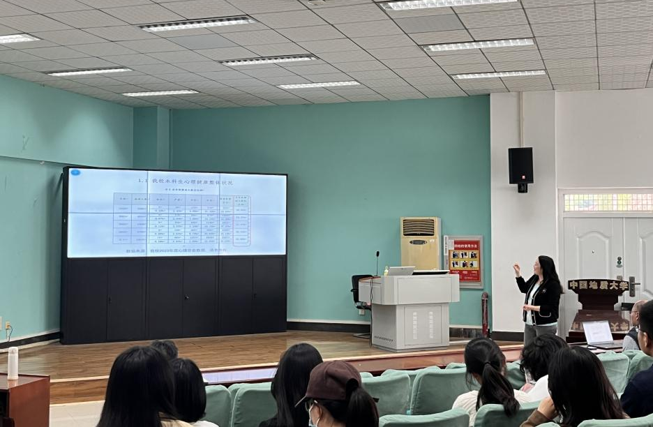 讲座一开始,周老师就运用本科生的有关数据,展示了近几年大学生的心理问题咨询数量和我校学生心理健康的整体状况。周老师表示,近几年学生心理问题咨询量逐年增多,2023年是2019年的1.43倍,学生心理健康状况整体下降的趋势表明,早期心理问题预防与干预工作迫在眉睫。