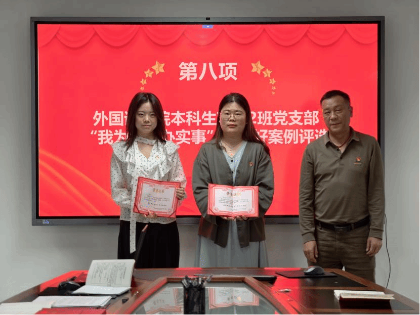 在学生党支部“我为群众办实事”月度好案例评选环节,支部全体党员分享他们在学习、生活中为师生办实事、解难题的点滴和感悟,经支部民主评选,陈晓红和毛欣如组织就业分享会和语言志愿服务的两个案例被评为五月“我为群众办实事”好案例,院直党支部宣传委员董成见同志为获奖同志颁发证书。