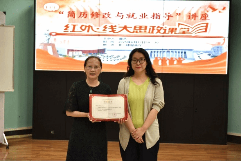 一个多小时的讲座,大家意犹未尽,踊跃提问请教。邹蔚鹤代表学院向曾艺颁发做客“红·外线大思政课堂”纪念证书,感谢她带来的精彩指导和对学院就业工作的大力支持。