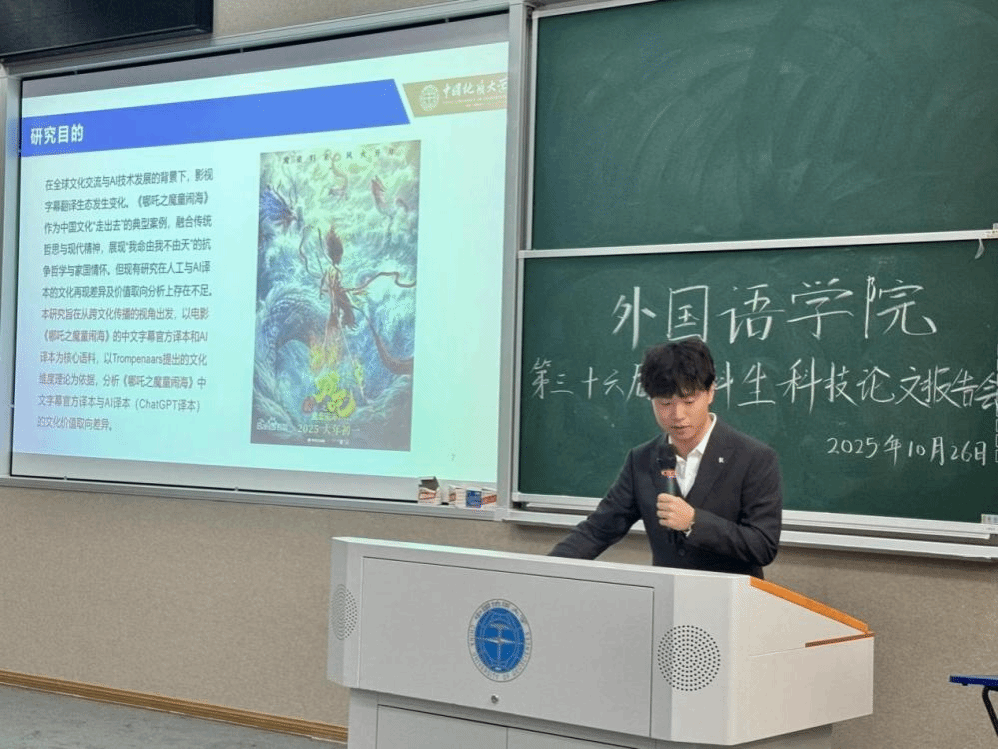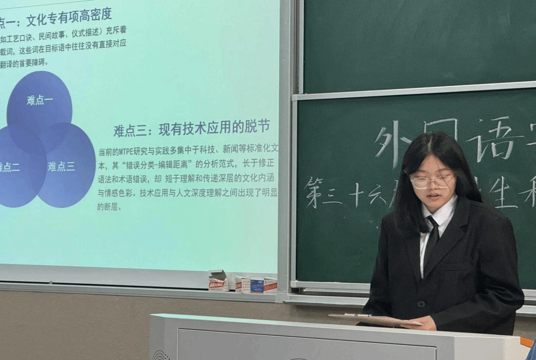 报告会正式开始,8名汇报人依次上场,参赛项目聚焦语言技术与文化传播前沿领域,涵盖非遗文化、教材研究及字幕翻译等多个方向。现场展示中,各团队围绕研究背景、方法创新与实践价值进行系统阐述,内容详实、逻辑严密。