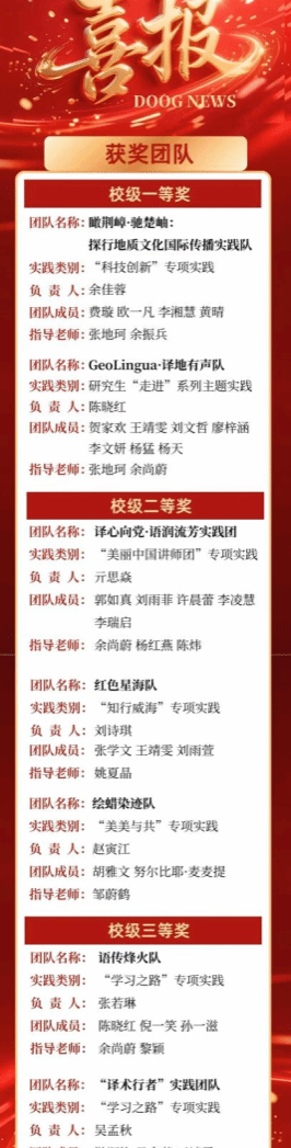译地有声团队用脚步丈量山河,用语言助力传播,针对湖北境内世界地质公园地质文旅的国际传播体系建设仍存不足这一问题,按照科研团队、导学团队、社会实践团队融合的思路,打造了12条沉浸式科普长廊,科学设计了13条旅游路线。该团队以地质为基,以文化为媒,以产业为核,立足湖北、辐射全国,用实践探索助力荆楚文化国际传播。