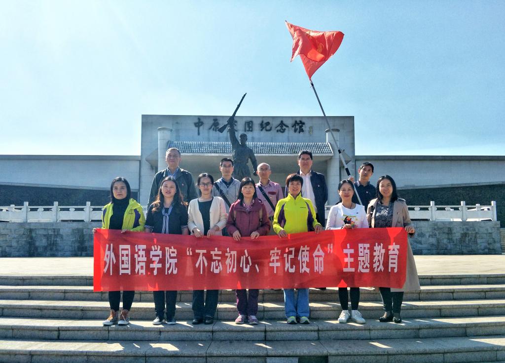 2019年11月9日上午8点,外国语学院领导班子及教工党支部支委一行12人乘车奔赴湖北大悟。上午首先到芳畈白果树湾参观全国百家经典红色实践基地之一的李先念新四军五师纪念馆、司令部旧址,瞻仰宋斌烈士墓。以李先念同志任师长兼政治委员的新四军第五师在此驻扎五年之久,依托大悟山天然屏障,部队由160人发展到5万余人,开辟了以白果树湾为中心,纵横千里的鄂豫皖湘赣五省的抗日根据地,大小战斗达1300余次,威震中原!