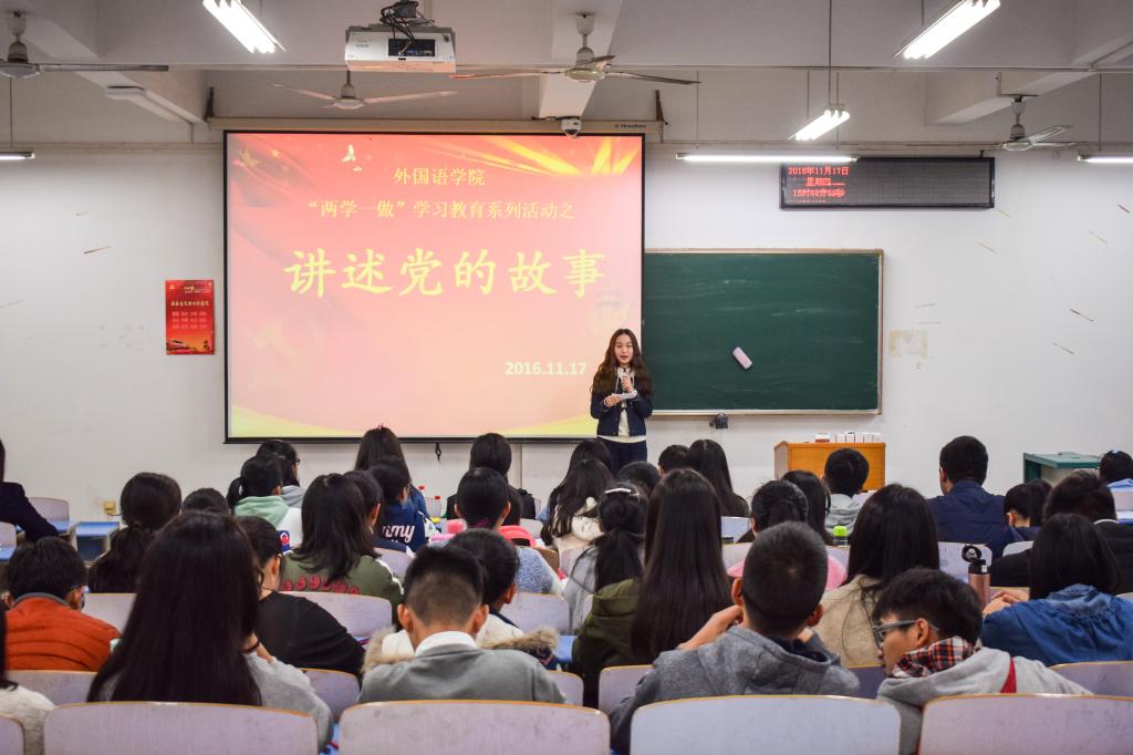 (通讯员罗颖)11月17日下午,九一果冻制作传媒视频“两学一做”学习教育系列活动之“讲述党的故事”比赛在北区综合楼206举行,本次活动由九一果冻制作传媒视频主办,九一果冻制作传媒视频本科生第一党支部承办,九一果冻制作传媒视频英语系教工党支部书记江敏,学工组李海涵、宁蒙担任本次比赛的评委,本科生第一党支部吴佩遥担任主持人,九一果冻制作传媒视频全体学生党员及九一果冻制作传媒视频第十九期入党积极分子参加了本次活动。