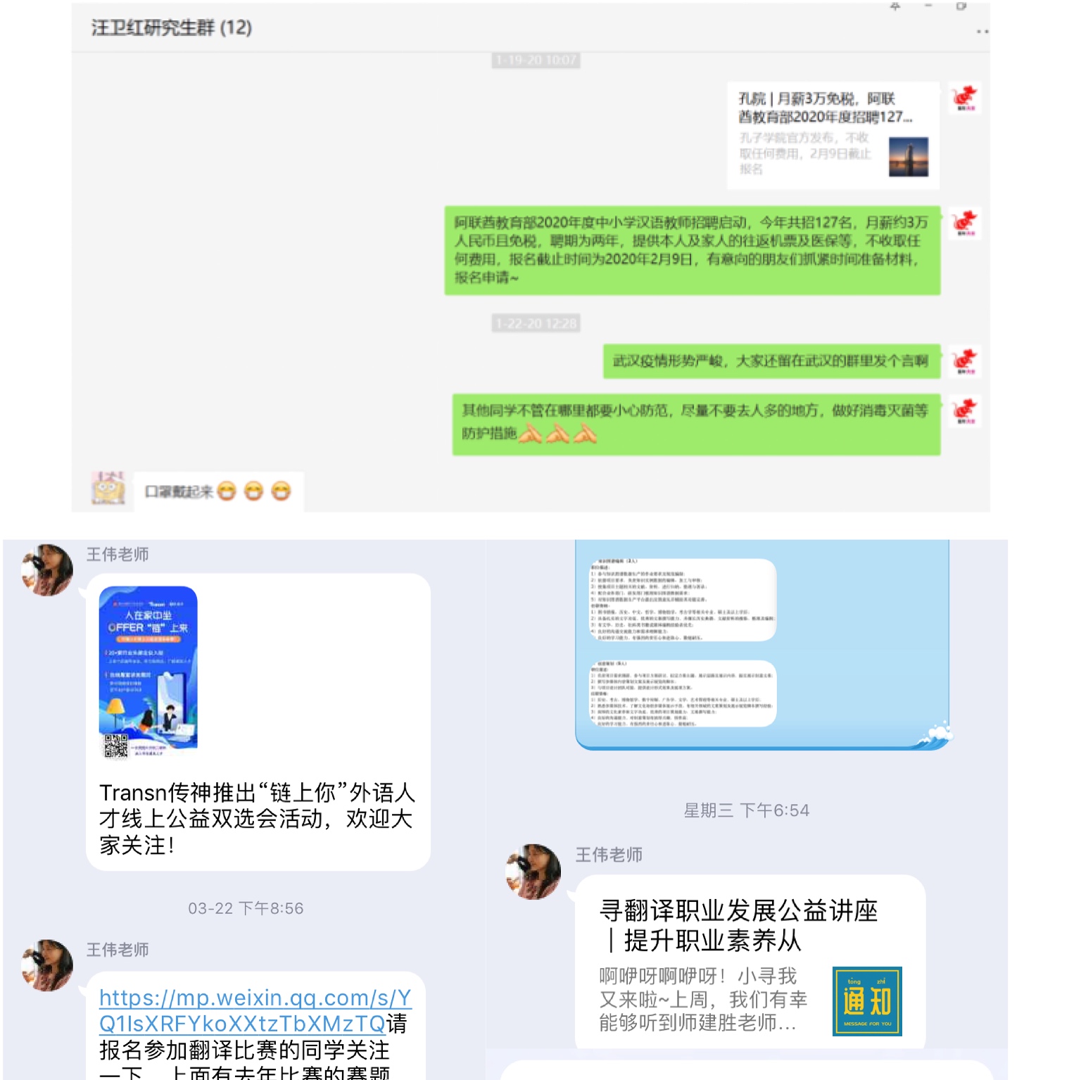 王伟老师和汪卫红老师在研究生群中发布招聘和培训信息